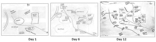 It should be noted that the sketches drawn by the participants who wrote diaries reflected, throughout their stay, a gradual increase in the number of features, whereas the reference system used remained constant, regardless of the tourist type (see Figure 10).