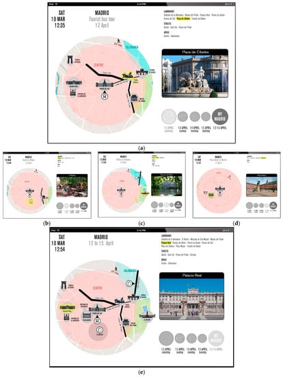Maps created for tourist T1 (Guided), illustrating the places to visit daily in Madrid. The pink circle shows the POIs reachable within a 20-min walk from the tourist’s accommodation, located in the city’s “Centro” zone. Maps in (a–d) take into account the average number of features and the differentiated reference system of the Guided participant’s sketches (cluster of elements organized around a fixed feature, the hotel). The map in (e) summarizes the information on the four previous maps in a coordinated reference system, in order to help user T1 to integrate the information of the daily experiences in a single map. During the stay in Madrid, the maps will evolve to distinguish the POIs and streets already visited, from the ones yet to be seen. If tourist T1 takes photos, they will replace the generic images. Places visited instead of or in addition to the initial plan will also be included.