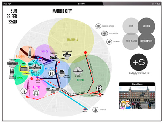 Maps for T1 and T2 include features from the collective conception of tourists in Madrid and customized icons (guideline 1). However, the number and type of features, as well as the reference system, is adjusted to the type of tourist (guideline 2). Finally, the elements included in each specific map adapt to the spatial task (context of use) and the individual’s interests and knowledge, and evolve over time, as the cognitive maps also do, in line with the tourist’s experience in the city (guideline 3). In the case of tourist T2 had a conditioned experience because, e.g., s/he had come to Madrid to take part in a conference, s/he would have moved as an Explorer in the free time, but his/her tourism experience would have been restricted and influenced by the amount of free time available and the location of the conference. Thus, the map presented in Figure 12 would have contained fewer elements but retained the same reference system. It would also have included the location of the conference, the transport lines used to go there, and the suggestions would take into account the location of the conference and transport timetables.
