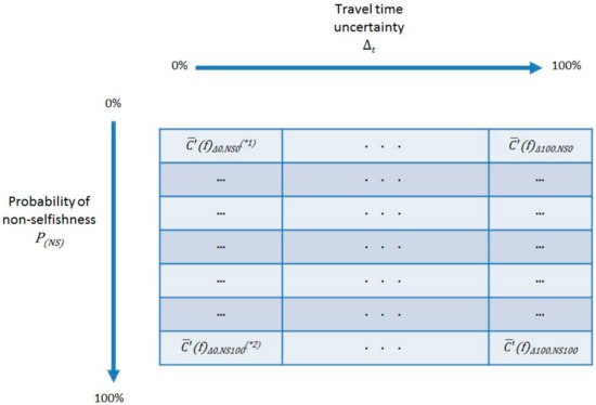 In Figure 3, the variable name for total latency value represents various levels of non-selfishness and travel time uncertainty. For example denotes the total latency value that occurs when the uncertainty level is 10 and the non-selfishness probability is set at 100. This means that represents delay incurred when the uncertainty in travel is at its lowest and when all agents’ decisions are selfish. The superscript (∗1) denotes that the additional edge BC is used, and superscript of (∗2) denotes that the edge BC is not used. This means that , marked with (∗2), denotes C(f) of the flow at Nash equilibrium without edge BC.