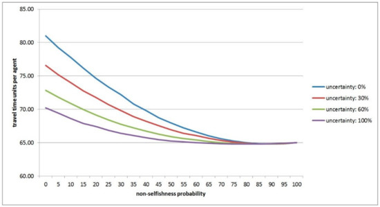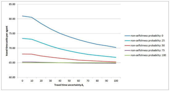 In Table 1 the average latency values (i.e., total travel time over 5000 simulations) per agent are given for different levels of travel time uncertainty and probability of non-selfishness. The results indicate that the higher the level of uncertainty in terms of travel time ∆t is, the lower is the latency or delay per agent (given a fixed probability of non-selfishness P(NS)). This is depicted in Figure 4 and Table 1. Generally, the prior statement holds true except for the set of latency times highlighted in orange in Table 2. The highlighted values at a given P(NS) level are the lowest calculated values for given ∆t values. With increasing ∆t the values of increase. In Figure 5 the behavior of latency values for varying P(NS) with a given ∆t value is depicted (see Table 1 for numerical values). There, the latency values for ∆t values 0, 30, 60, 100 are depicted, showing decreasing latency values per agent with increasing P(NS). This monotonically decreasing behavior is present from P(NS) levels 0 to 90 (for ∆t ranging from 0–30), for P(NS) levels 0 to 85 (for ∆t ranging from 40–70), and for P(NS) levels 0 to 80 (for ∆t ranging from 80–100).