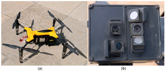 (a) is a multirotor unmanned aerial vehicle; (b) is a five-lens camera carried by the UAV.