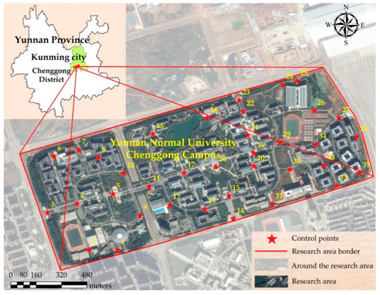 In this paper, we comprehensively take various factors into consideration, including the climate conditions, topographic and geo-morphological conditions, operational feasibility, and human environment. Finally, the Chenggong campus of Yunnan Normal University in Chenggong, New District of Kunming City, Yunnan Province, was selected as the test area for UAV image acquisition. The latitude and longitude at the center of the Chenggong campus of Yunnan Normal University are 24°51′59′′ N and 102°50′58′′ E, respectively. The area covers approximately 1.43 km2, and its average elevation is above 1900 m. The airflow was relatively stable during the photographing process, and the pressure was moderate, which is conducive to acquiring high-quality aerial images. Moreover, the research area has good transportation and an open space far away from the airport and other no-fly zones, which were convenient for UAS equipment transportation, takeoff and landing. In addition, the research area includes rich geospatial features. For example, it includes buildings with various geometrical characteristics and heights, water bodies, vegetation, and roads, which have a universal representation. The research area is shown in Figure 2.