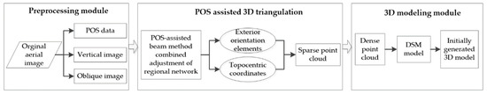 The general 3D modeling process based on UAV oblique imagery technique includes field data acquisition, image preprocessing, aerotriangulation, dense matching, digital surface model (DSM) construction, and texture mapping. In this paper, the 3D modeling process is divided into three modules: a data preprocessing module, a POS-aided aerotriangulation module, and a 3D model construction module, each of which is described as follows. (1) Data preprocessing module: the UAV images are obtained in the field, and image preprocessing is completed (including image denoising, intensification, and rough correction of POS parameters); (2) POS-aided aerotriangulation module: the POS data are taken as the initial values to establish the error equation. The accurate exterior orientation elements of images and topocentric coordinates are calculated by the bundle block adjustment method, which can generate a sparse point cloud. (3) 3D model construction module: Multiview dense matching is performed on the aerotriangulation results to generate a dense point cloud; then, the DSM is established, and textures are mapped to form the initial 3D model. The steps in these three modules are depicted in Figure 3.