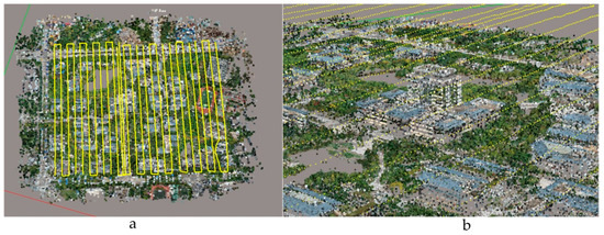 After image preprocessing, the point cloud data of the research area are obtained through aerotriangulation. First, the POS data are fused, and taken as the initial value for the combined bundle block adjustment. Then, various stereo models are connected by relative orientation, and a spatial similarity transformation is used to complete the absolute orientation and obtain high-precision exterior orientation elements and the approximate values of the topocentric coordinates for the pictures. Eventually, sparse point clouds are generated. The initial aerotriangulation results are shown in Figure 7.