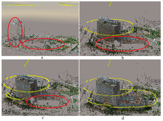 (a–d) Representations of the aerotriangulation results aided by varying levels of loop-shooting.