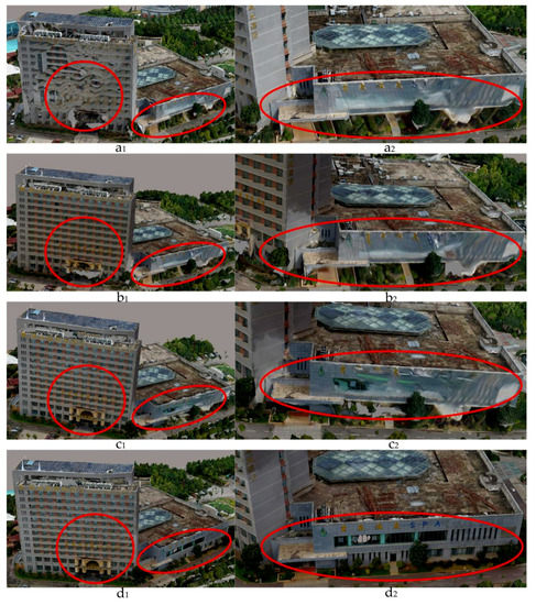 To comprehensively display the effect of 3D modeling assisted by loop-shooting-aided technology, we generated four 3D models corresponding to the four 3D triangulation results to construct views of the “Fontaine Blanche Hotel” of Yunnan Normal University. These four model results are shown in Figure 10. The regions with differences in the figures are marked in red.
