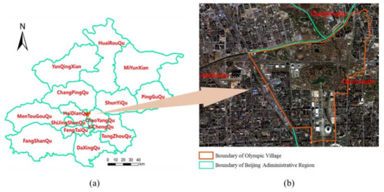 Location of the Olympic Village area. (a) Location of the Olympic Village within the administrative divisions of Beijing; (b) remote sensing imagery showing the boundaries of the Olympic Village within central Beijing.