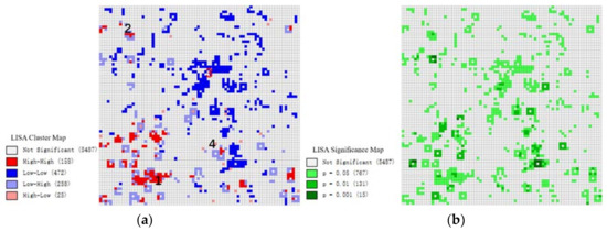 (a) The local indicator of the spatial association cluster pattern of the difference between SUMweekday(i) and SUMweekend(i); (b) the local indicator of spatial association significance map (p < 0.05).