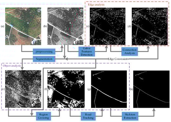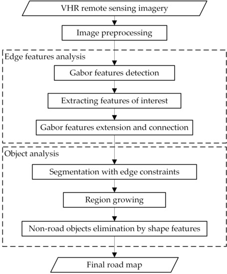 As shown in Figure 1, the two-step automatic road extraction approach is proposed. (1) Edge features analysis: preprocessed imagery was convolved with Gabor wavelet kernels for its invariance to illumination, rotation, scale, and translation, and sensibility to line features to detect responsive features. Then, a window-based method filtered undesired features such as the aforementioned disturbances. After that, to transform the feature analysis in a line-segment-based manner, screened features were processed into line segments by a line-segment detection (LSD) algorithm. Adjacent pair segments were then connected if three criteria were satisfied, which helps supplementing the completeness of line features; (2) object-analysis: connected Gabor features served as edge constraints for segmentation to obtain stable segmented objects. Then, by region-growing, road objects were expanded to complement their missing parts, whereas nonroad objects to highlight nonroad characteristics. Finally, fundamental shape features, including area, shortest inner diameter, complex rate, length–width ratio of the bounding rectangle, and the fullness ratio were used to extract potential target objects.