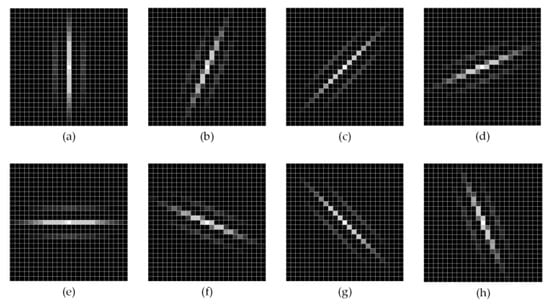 Considering the necessity of recording strong responses and the precise orientation of road recognition and connection analysis, N = 16 was set in this study and proved sufficient for highlighting road features with definite orientation. Gabor features detected in a small range of orientations in some degree represent a strong correlation. It is dispensable to set N as a quite-large value for high direction accuracy while causing great loss in efficiency. When N is too large, convolutions applying these excessive Gabor filters with images would consume unnecessary computational resources. For each scale, there were 16 response maps corresponding to 16 directions. Specifically, if the phase offset φ = 0, we only considered eight directions in the range of [0, π). Figure 2 shows the Gabor bank in eight orientations.