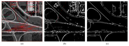 Pixel-based edge detection is a fundamental part for some road-extraction works, and typical methods for line-feature detection [12,13] can present fairly complete edge information. This type of road-extraction analysis [14,15,16,17] is largely accomplished by exploring the spatial characteristics of line features. Lisini et al. [18] proposed a method that applies adaptive filters, the response of which was then used to extract linear features and perform connection work. This method depends on different hard thresholds and data-dependent parameters, thus needing quite a lot of user interaction to optimize the parameters. In Reference [19], a novel aperiodic directional structure measurement (ADSM) was used to construct a mask denoting potential road regions; then, the mask was consolidated with canny edges. The limitation of this method is that considerable errors would occur in road regions with shade or occlusion, since both the geometric and spectral features were affected in different degrees. Only taking edge information into account without considering the spectral characteristics of the road regions can also sometimes make it difficult to distinguish road edges from other objects that possess similar geometrical-line features.