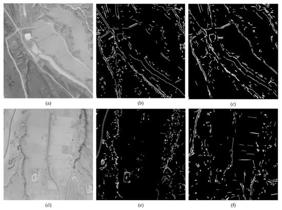 When the extraction work was done, these features of interest were then merged into one map. It is worth mentioning that the method was not merely to extract road edges, but general edge features with potential possibilities to distinguish targets from backgrounds. When facing a scene where edge information is not so conspicuous, it is important to choose an appropriate filter threshold to balance the detection of desired edge features and undesired noises. Figure 4 shows the edge-detection results by the canny algorithm and the proposed method of an origin image in a rural part of Dingbian County, China, with a resolution of 0.4 m, where both the similar spectral representation of dirt roads to the background and the coverage of sand from the background on the road surface make it difficult to maintain the balance mentioned above. From the results, we can see that, for road-edge detection, the proposed method performs better at balancing the detection of “weak edges”, while filtering noises and edges without directional consistency.