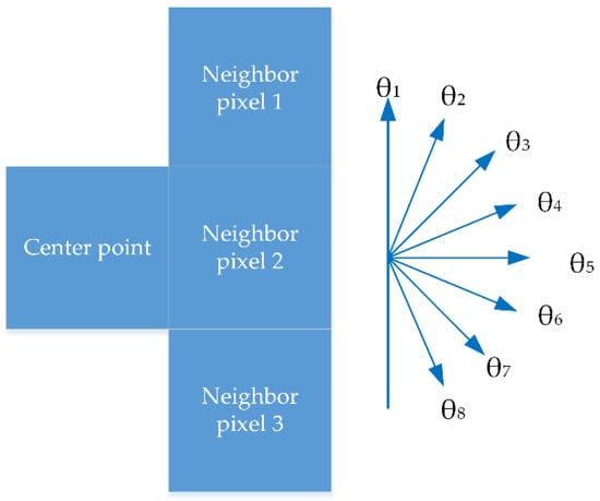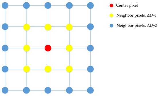The multichannel imagery combined with the R, G, and B bands was divided into three grayscale images. We first assigned an appropriate neighborhood range ΔD according to the spatial resolution of the imagery set; ΔD determined which neighbor pixels within the range should be taken into account, as shown in Figure 7. For each pixel Pr,i,j(x, y), where r means R band, i means the pixel in the ith row of the image, and j pixel in the jth column, the absolute difference in gray values with its neighbor pixels Pk was assigned to Sr,k, same operations were executed for Pg,i,j(x, y) and Pb,i,j(x, y) to obtain Sg,k and Sb,k. Sk = Sr,k + Sg,k + Sb,k was used to determine whether there was gray consistency between Pk and Pi,j(x, y). Only all neighbor pixels within ΔD satisfied gray consistency; with Pi,j(x, y), we ensured the stability of Pi,j(x, y) belonging to a specific object. Sk, which evaluates pixel stability, was inversely proportional to the possibility of a pixel belonging to certain objects. In the system, a threshold value ST was set to judge the stability of a pixel. If Sk were less than ST, the corresponding pixel was labeled with flag = 1 for its stability. In the other case, the pixel was labeled with flag = 0. Edge constraints were utilized by judging whether Pi,j(x, y) and its neighbors were of pixels on Gabor features. Once the judgement was true, Pi,j(x, y) was ascribed to unstable types and labeled with flag = 0. When all pixels in the image were processed, we assigned gray values of 0 and 1 to Pi,j(x, y) according to its label to obtain the binary image. Details of the segmenting scheme are shown as Algorithm 1: