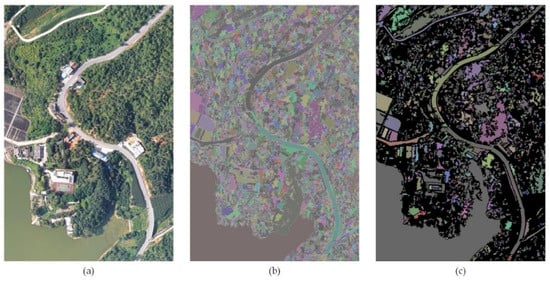 The studied imagery of this part was of a rural area of Panzhihua City in China, with a spatial dimension of 2500 × 2500 pixels and a spatial resolution 0.1 m per pixel. The original color image with the R, G, and B bands is shown in Figure 11a.