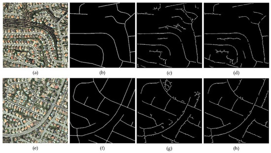 Figure 12. Comparison of the method of Lei et al. [26] and the proposed method in an urban area; (a,e) original image; (b,f) road-vector data from manual acquisition; (c,g) results of the method of Lei et al.; (d,h) results of proposed method.