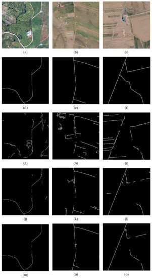 Figure 13. Comparison of the method of Zang et al. [19], Lei et al. [26], and the proposed method in a rural area. (a–c) Original image. (d–f) Road-vector data from manual acquisition. (g–i) Results of the method of Zang et al. (j–l) Results of the method of Lei et al. (m–o) Results of proposed method. - Dingbian Road dataset: The dataset consists of about 200 images acquired from aerial photography, covering a part of rural region of Dingbian County, China. The size of all images is 2163 × 1532 pixels with spatial resolution of 0.4 m per pixel. The dataset was collected from a crossing research project. In this work, Figure 13b,c were cropped images from this dataset.