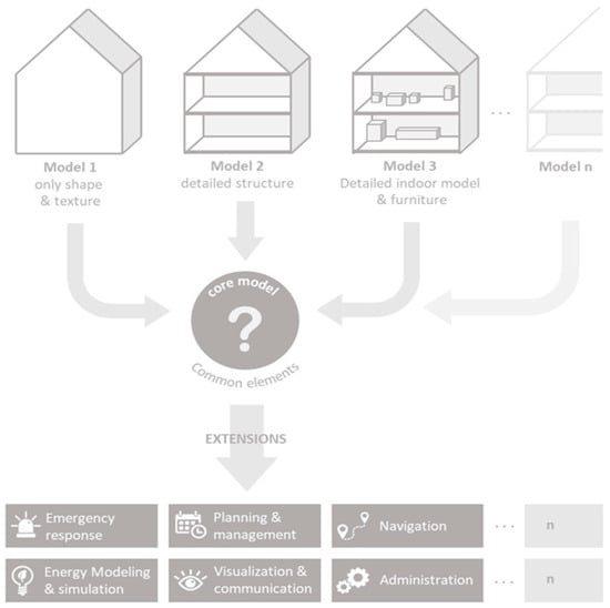 Even if models of the same object are developed for different tasks, they still might have some kind of “greatest common divisor” that is useful independent of any specific use-case. One example would be the definition of a model for a river, where an agreement on the geometric (line or polygon) as well as the semantic aspects (e.g., name, depth, quality) needs to be made. An example for a meta model has been suggested for energy modelling [57]. The same also applies to building models. Thus, a “core model” or “meta model” of a building is needed which should be as easy as possible with agreed parts and attributes. If needed, the model should be expandable for different tasks by the users of the specific discipline. In this publication, we will only focus on a common agreement on the semantic aspects of a building, not on the geometric implications and representations.