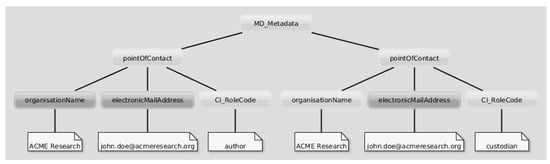 Figure 1 provides a visual representation of the XML nodes indicating “John Doe” as both the creator and the custodian of the resource in ISO metadata. Note that arcs abridge the traditional verbosity of nested XML structures in ISO 19139 encoding; in addition,
