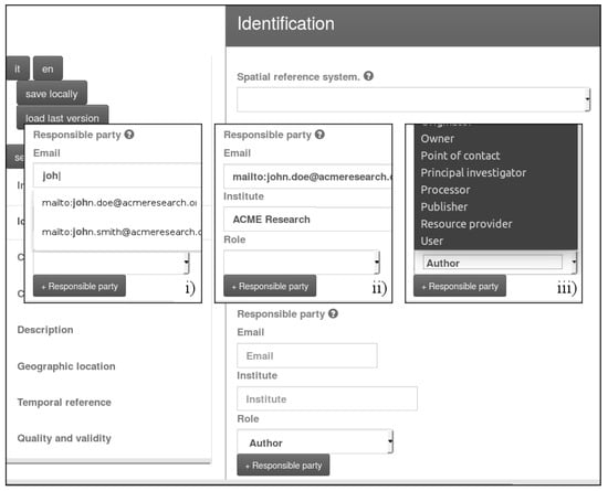 Figure 2, iii). The mechanics of completion of the last two fields is omitted in Listing 1 for brevity. Further assisted editing functionalities include autocompletion on the basis of HTTP parameters in the call to the editing interface, on-demand generation of field values (e.g., to generate unique identifiers), and combination of values from other metadata fields.
