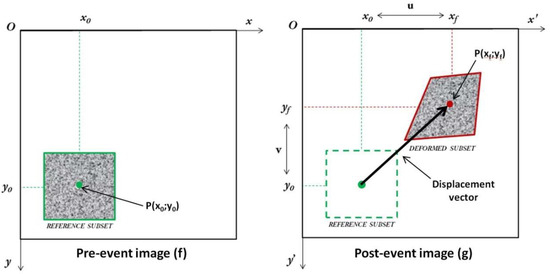 where F(x, y) and G(x*, y*) represent the intensity values within the subset of the pre-event and post-event images, respectively; (x, y) and (x*, y*) are the coordinates of a point on the subset before and after deformation, respectively; and the symbol Σ represents the sum of the values within the subset. The coordinate (x*, y*) after deformation is related to coordinate (x, y) before deformation. Hence, the displacement components are obtained by determining the best setting of the coordinates after deformation (x*, y*) that minimize or maximize the R or NCC parameters [53].