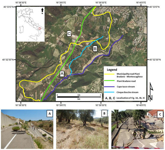 SW slope of Montescaglioso Village, which was affected by the landslide occurrence (3 December 2013). Local evidence of damage to primary infrastructure and private fields (A,B) obtained during the field survey in July 2016, and buildings (C), from Reference [39]. Coordinate system: WGS84 UTM33N.
