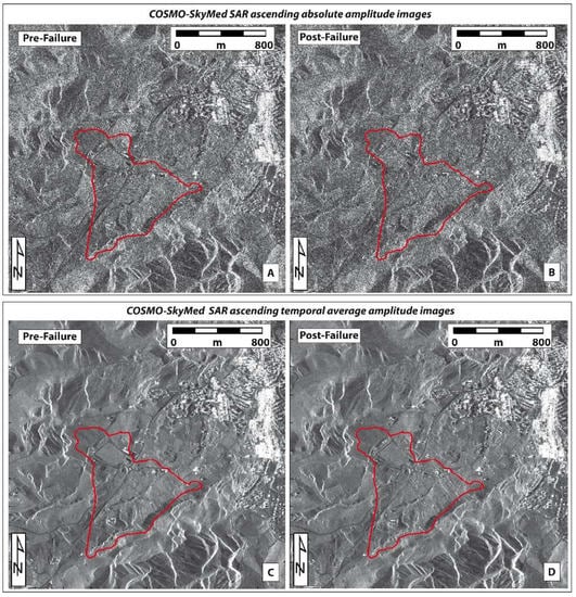 Pre- and post-failure CSK SAR amplitude datasets (in ascending geometry). The difference between the absolute amplitude (A,B) and the temporal average amplitude imagery (C,D) is clearly visible.