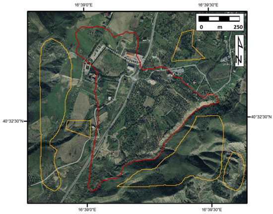 Moreover, the field survey activities allowed for the reconstruction of the kinematic evolution of the Montescaglioso landslide by identifying all of the slope sectors involved in the 3 December event. As shown in Figure 3A–C, local infrastructure, buildings and private fields were seriously damaged and visually displaced. The occurrence of wide and deep ground tension cracks, and all of the new geomorphological features in the sectors highlighted in Figure 3, were used to improve the calibration and definition of the landslide boundary compared with the previous delineations in References [38,41]. Subsequently, based on photo-interpretative observations and terrain analyses performed in a Geographic Information System (GIS) environment, the triangular-shaped boundary of the Montescaglioso landslide has been defined, as previously suggested by the authors of [38,41].