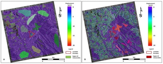 Regions of interest (ROIs) used in approach #2. Here, the ROIs have been intentionally designed over a wider sector by arbitrarily choosing those areas not affected by the general movement of the slope failure. In (A,B), two different series of ROIs have been highlighted in green tones (A) and red tones (B).