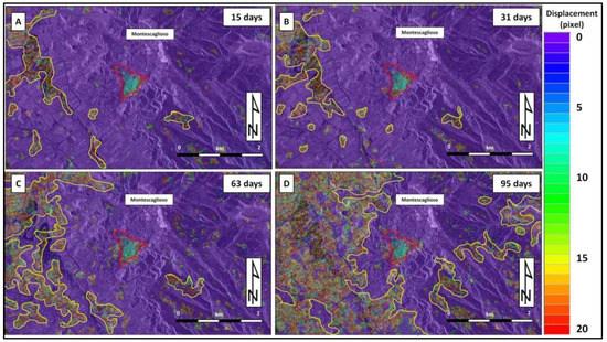 DIC displacement maps retrieved from CSK SAR ascending absolute amplitude images. Here, an increase in the areas affected by the decorrelated signal from (A) to (D) (highlighted in yellow polygons) in the surrounding sectors of the Montescaglioso landslide area (red polygons) is clearly visible. The time span between the pre-event (3 December 2013) and post-event images increases from the top left to bottom right: (A) 18 December 2013 (15 days); (B) 3 January 2014 (31 days); (C) 4 February 2014 (63 days); and (D) 8 March 2014 (95 days).