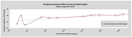 Temporal resolution effect on the decorrelation signal. A direct relationship was achieved, which is also perceptible from the trend line (dashed black line).