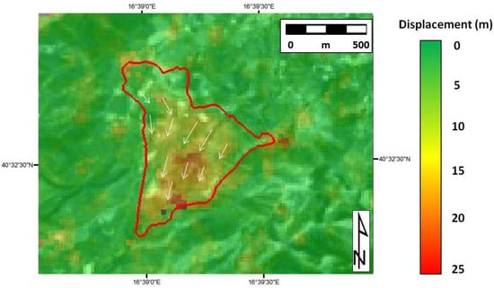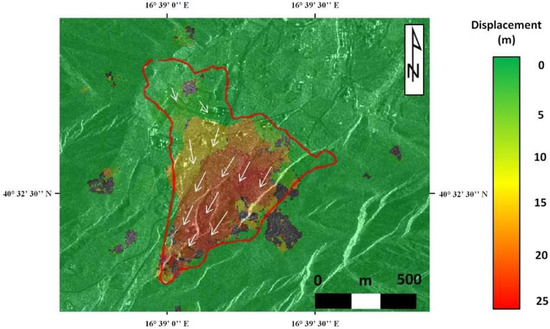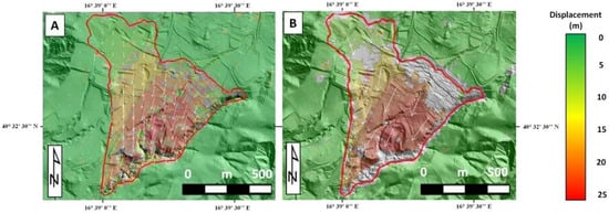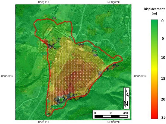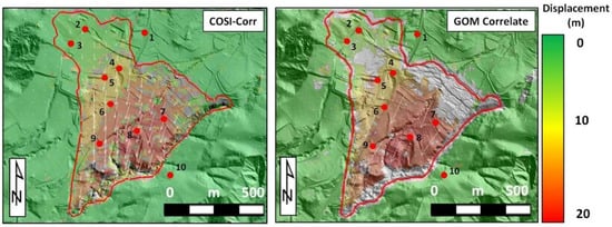 The deformation of the Montescaglioso landslide area (Figure 6) was measured for each dataset shown in Table 1 using both the COSI-Corr and GOM Correlate software, setting a correlation threshold of 0.9. The best parameters for use in each analysis were identified through a trial and error approach, and the results are shown in Table 4.