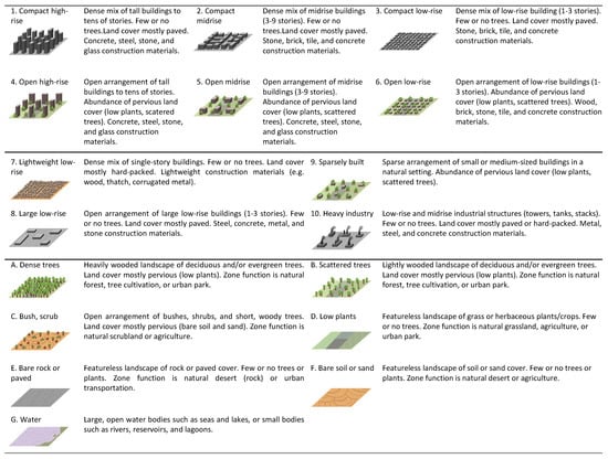 The local climate zone (LCZ) classification system is designed as a categorical scheme with 17 classes that describe urban landscapes [,]. These classes are defined based on surface structures and surface covers, which are specifically (1) the height of the surface structure, (2) spatial density of the surface structure, and (3) covering material of the surface (i.e., as shown in Figure 1). Eventually, the scheme yields thematic maps of a 100-m ground sampling distance (GSD), with each pixel labeled as one of the 17 classes. The LCZ was designed for the study of urban temperature behavior. It provides a research framework for urban heat island studies and standardizes the worldwide exchange of urban temperature observations []. As also shown in Figure 1, the scheme essentially demonstrates morphological structures of urban local neighborhood. The urban morphological structure is an influential factor on thermal behaviour. It may also reveal the economic status and the population distribution of a particular city. For example, slum districts, which are less economically developed regions with massive population concentration, normally appear as the seventh class in Figure 1. Therefore, thanks to the described morphological structure, the LCZ map acts as a valuable source for a wide variety of studies in urban areas.