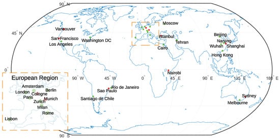 Our study aims to produce LCZ maps on a global scale and also focuses on cities of high population density. In total, 29 cities were selected and listed in Table 1. They are located on all continents except Antarctica, shown in Figure 2. This geographical distribution ensures that cities of interest include transcultural, transnational, and cross-environmental regions. While selecting these cities, population was another criteria under consideration. Among all cities, the population of each city was at least one million in 2016 and is expected to grow in the future according to UN statistics []. To enable our framework to solve the global challenge, cities of different regions were selected for both training and testing. The selection is shown in Figure 2 and Table 1.
