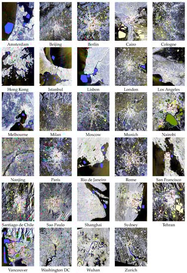 After the data preprocessing, the analysis-ready dual-Pol data is organized in the common PolSAR covariance matrix. The processed Sentinel-1 dual-Pol data of 29 cities are shown in Figure 3.