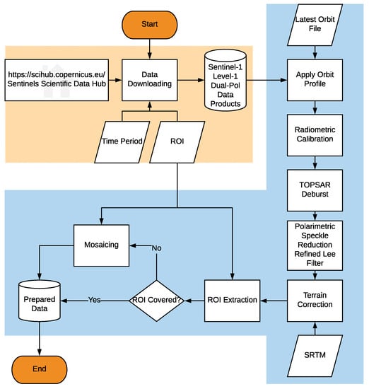 Flowchart of Sentinel-1 data preparation. Module with orange background indicates data downloading part. Module with blue background indicates data preprocessing part.