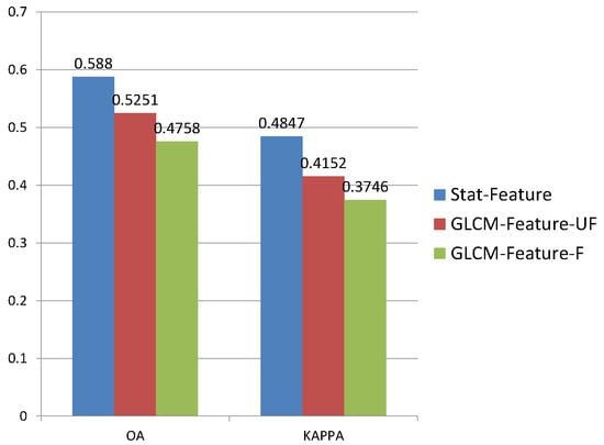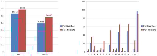According to Figure 6, the Stat-Feature outperformed the Pol-Feature by 5.68% and 0.088, in terms of OA and the kappa coefficient, respectively. It also performed better generally on producer accuracies. Considering the challenge of global scale in our work, the difference is quite dramatic, but not surprising. It has been proven in remote sensing that involving spatial information can significantly improve the classification performance [,,]. Consequently, the Stat-Feature was selected as the benchmark feature to work with the other two features.
