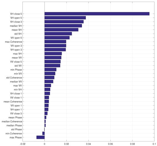 Figure 9 shows the feature importance achieved by canonical correlation forests using all test samples. The empirical importance indication reveals several interesting phenomenons. Firstly, the most important three features are components of the MP-Feature. The morphological spatial feature plays a very important role in our global LCZ classification task since LCZ classes describe the morphological property of an urban local neighborhood. Secondly, the VH polarized data contributes the most to the classification because eight out of top ten important features (all top six), are related to VH data. Thirdly, the coherence of VH and VV data also contribute the classification; however, it has often been ignored when using PolSAR data. Lastly, features on the relative phase between VV and VH barely provide any information because they are all among the least important features.