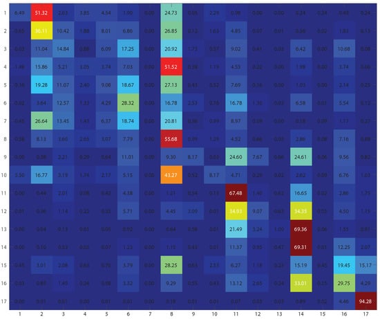 Confusion matrix of the classification framework on feature combination E, which is the best feature combination in terms of OA. Numbers are reported in percentages.