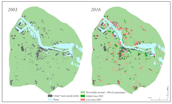Distribution and proximity to green space within Amsterdam ring zone. Data Sources: Land-use classifications were made based on Worldview 2 satellite imagery for 2003 (resolution 0.46 m) and Quickbird imagery for 2016 (resolution 0.64 m). The data was provided by Digital Globe (2018) [44] All calculations made by the authors. * urban land includes built-up as well as non-green barren land.