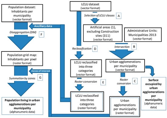 Figure 1 explains the methodology adopted for the evaluation of the surface occupied by urban agglomerations and correspondent population, per municipality. Steps A and B illustrate the assessment of the area occupied by urban agglomerations in each municipality.
