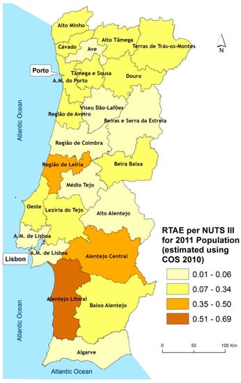 Figure 2 presents the validation results of the population grid map produced for 2011 (using COS 2010 as ancillary data), by NUTS III regions. This figure depicts the RTAE variation across regions and enables the identification of those presenting higher RTAE values than the Mainland value (0.34), namely Alentejo Litoral (0.69), Alentejo Central (0.35), and Região de Leiria (0.46).