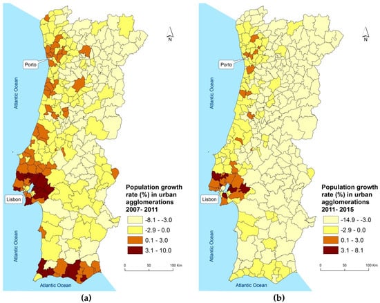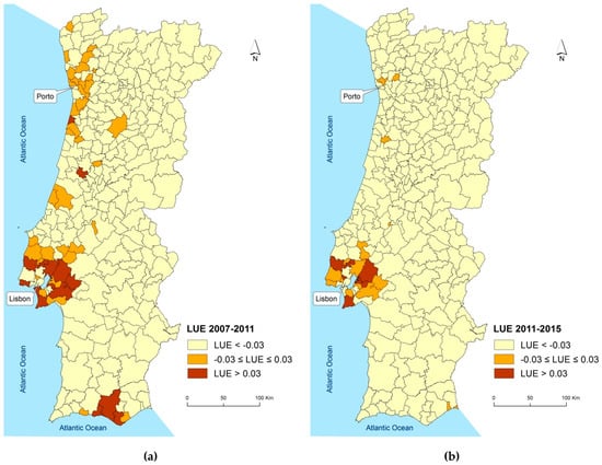 As mentioned in Section 1, the indicator 11.3.1 was assessed at the municipality level for Mainland Portugal using two mathematical expressions: the formula currently proposed by the UN-Habitat [1] and a Land Use Efficiency (LUE) adapted formula proposed by Corbane et al. in 2017 [13].