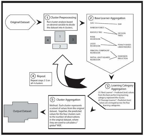 The cluster-based ensemble algorithm begins by running a cluster analysis on the original input dataset, dividing the dataset into four clusters based on a chosen independent variable that is equal to the number of learning categories. Justification for clustering lies in the idea that for a regression problem, by running the ensemble on N clusters representing homogenous subregions within a global dataset, there will be less variation within each cluster, which will therefore result in each learner fitting a more tailored, accurate model that is local to each specific subregion in the dataset. Additionally, we have applied 10-fold cross-validation (90%/10% approach to training and testing) for each base learner in combination with aggregating cluster results to the ensemble level in order to reduce the possibility of overfitting at the cluster level [,]. Rather than summarizing variable importance and explanatory power across the entire dataset at the global (entire dataset) level, in our approach, interpretation and inference will instead happen at the more localized, cluster level.