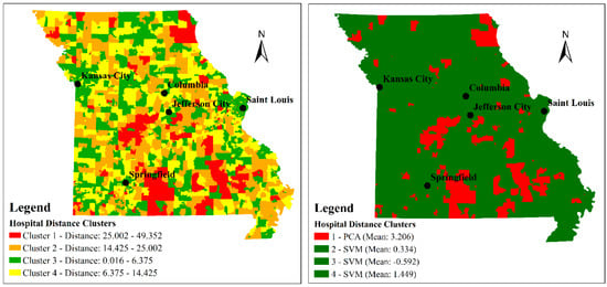 Results indicated that the best-performing model used the principal component analysis (PCA) method for fitting the first cluster, followed by an SVM to fit the latter three clusters, which was used for the basis of Table 8. Another finding is that the higher count of individuals speaking only English tend to be associated with a higher count of uninsured persons, specifically only in areas that have the greatest relative distance away from hospitals, where most of the inhabitants are white to begin with. Practically, this means that in the areas that are farthest away from medical facilities, race and income are major factors in the determination of health insurance status. In the latter clusters representing areas closer to medical facilities, there is significant variation in variable makeup. However, since the SVM technique measures relative variance rather than producing a standardized coefficient, the direction of the relationship cannot be determined. In the clusters closer to medical facilities, it can be inferred that income, population density, and education tend to be the most significant variables in terms of estimating health insurance status. While race was found to be a significant estimator, it can likely be explained through a lack of diversity in rural regions, where in Missouri, racial clusters tend to follow population clusters.