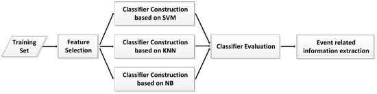 Extracting unlabeled event-related information from geo-tagged social media datasets could be formulated as a binary classification problem and solved with machine learning methods. As shown in Figure 2, the whole process starts with the construction of training data, continues with feature selection and the construction and evaluation of classifiers, then terminates with the extraction of event-related information.