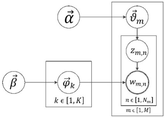 The topic model is a type of statistical model used to discover the latent semantic structures of a text body. It helps us to organize and gain insights into large collections of unstructured text bodies [45]. Probabilistic Latent Semantic Analysis (PLSA) and Latent Dirichlet Allocation (LDA) are the prevailing methods used for selecting representative terms in text collections [46,47]. In our experiments, we chose LDA since it is the generalization of PLSA and can create results to better explain the text semantics. LDA is a Bayesian graphical model and has three layers of “document–topic–word” [48]. The graphical model of LDA is shown in Figure 3. Its generative process is presented as follows: