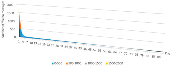 As shown in Table 2, although KNN and MultinomialNB achieve high precision, the recall scores and F1_scores are relatively low. BernoulliNB and SVM perform well, while both SVM methods achieve the best performance at the same time. This result fits the characteristics of the SVM explained in [57]. Considering that SVM with linear kernel has fewer parameters and faster computing speed, we selected SVM with linear kernel to classify three months of Weibo data after the event occurred, and 2425 event-related data records were obtained, as seen in Figure 4. We found that these data were mainly posted during the first week after the event. The first day of Weibo data posted up to 1729, and then, from the second day on, the attention to the event gradually decreased. After one week, little attention was paid to this event, but on the 13th day and the 21st day, the concern increased significantly. On the 13th day, a related news item was released, according to which leaders of the Huangpu district abused public funds to eat and drink in a nearby restaurant when the stampede happened. On the 21st day, the Shanghai municipal government announced the investigation results of the stampede. Obviously, these two related events were the main reasons for the increased attention to the tragic event.