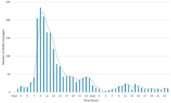 Figure 5 illustrates the Weibo numbers of the 48 h after the event. We can see that although this event happened at midnight, it stirred up some attention in the first few hours. A number of Weibo messages were posted from seven o’clock in the morning, peaking at nine o’clock. Early morning is a period during which all kinds of news travels fast. After 9 o’clock, attention to the event slowly decreased and reached the minimum at four o’clock the next morning before another wave of attention ensued.