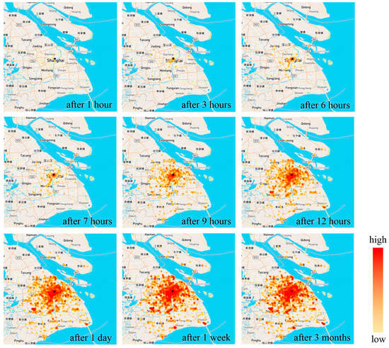 As seen in Figure 4, Figure 5, Figure 6 and Figure 7, event information can spread rapidly through the internet. As the 2014 Shanghai stampede occurred at midnight and most people were sleeping at the time, the event-related information spread slowly in the first few hours until most people gradually woke up and communication of the event proliferated rapidly. It took just two hours for the event-related information to cover the entire Shanghai area, indicating both the wide reach of the internet and the great impact of this event. As can be seen from Figure 6 and Figure 7, the impact on the everyday lives of the public caused by the event is centered on the site of the incident and continues to spread outwards in space. To a certain extent, this reflects the law of network transmission of emergencies, which is spatially diffused from the incident site to the outside.